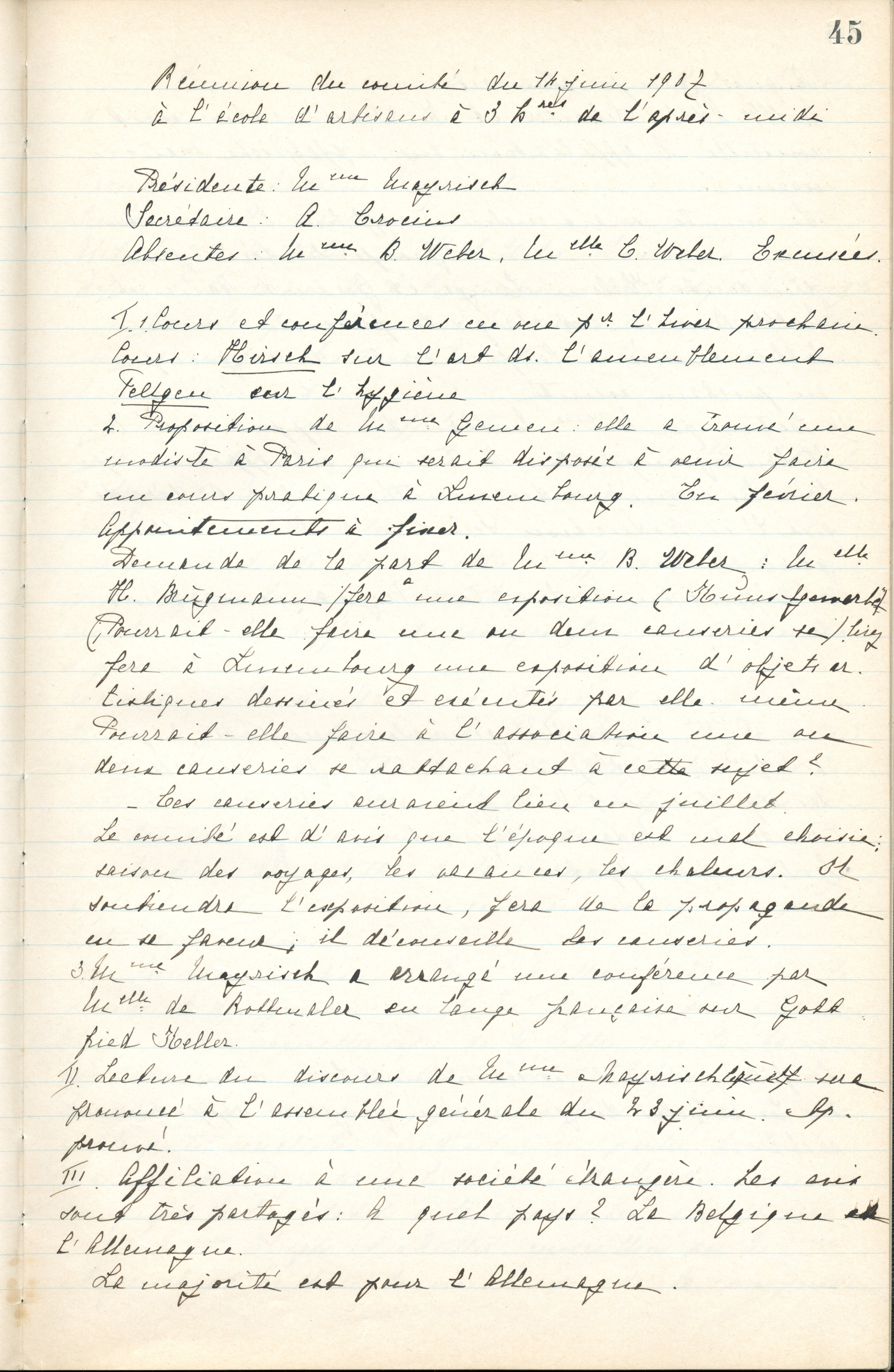 En lien avec cette conférence, l’association luxembourgeoise entreprit une enquête sur les conditions de logement des couches sociales les plus modestes, dans les quartiers de Grund, Clausen et Pfaffenthal. Pour cette enquête, les femmes se rendaient en groupes de deux et visitèrent 258 appartements et 90 maisons.